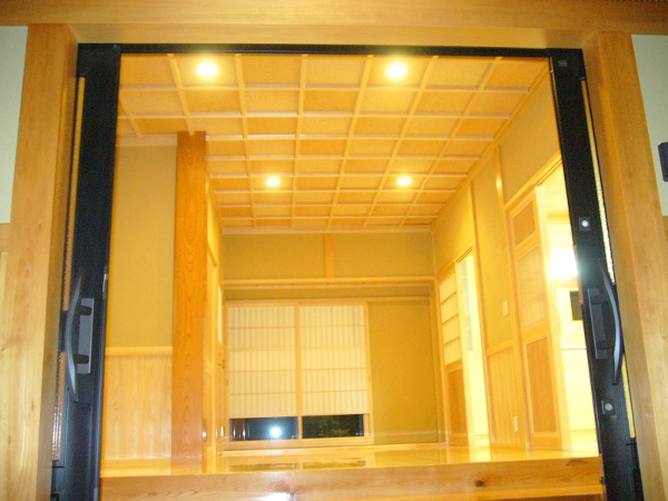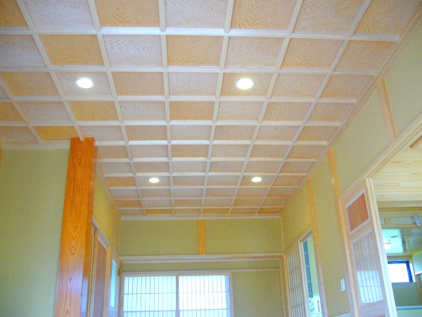 ダイナミックな格子組天井です。これだけ広い格子組天井は、初めてつくりました。とても美しいの一言です。