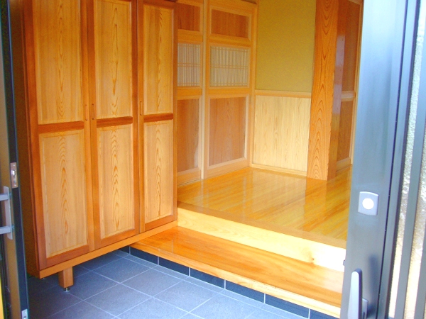 玄関収納は、特別生産していただきました。 欅(ケヤキ)の上り框・式台もすばらしいです。 正面に 欅(ケヤキ)の大黒柱です。