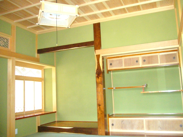 真壁づくりの構造に無垢の杉板張りと珪藻土塗りの壁、無垢の桐板張りと珪藻土塗りの天井、 と最近の流行の素材を