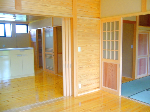 うまく利用してあります。 床は、無垢の桧縁甲板です。3枚引き込み戸も見えますね!