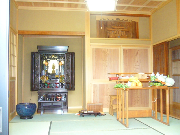 仏間・神棚まわりにも以前の家から はずして使った材料(欅・桜)が、落し掛け・無目・子柱などに再利用してあります。 エコです。