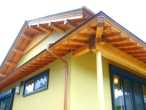 化粧屋根の下屋(ひさし)は、北側西の突出したところから ~ L型 ~ 若者世帯の南側まで、連続しています。 まるで